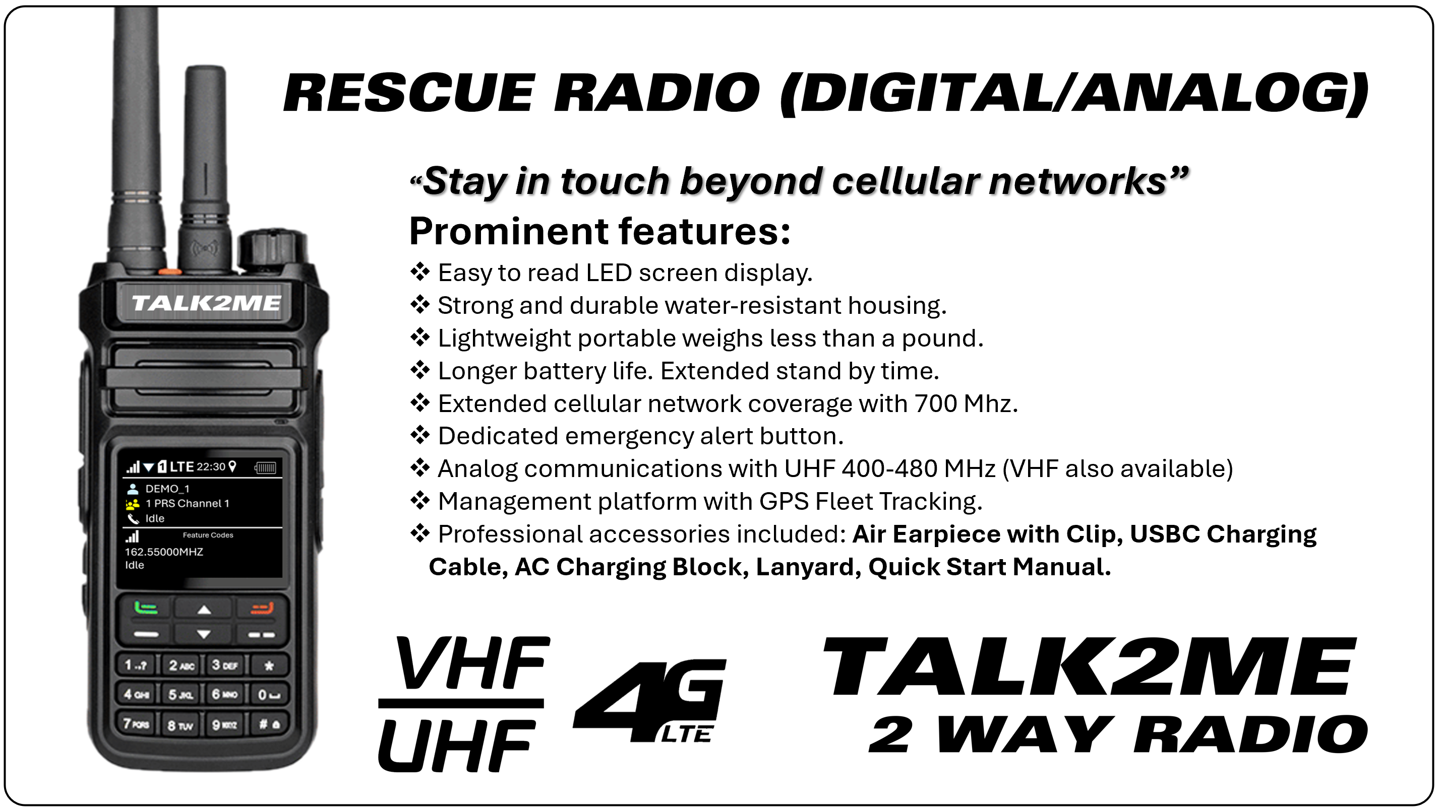 Stay connected with talk2me Rescue Walkie-Talkie featuring 100+ public channels and 1 private channel and access to the entire VHF Analog spectrum (136-174Mhz) with a robust transmission power of up to 5 Watts. With its professional design, this Walkie-Talkie is a reliable communication tool for all your outdoor adventures, work operations, and emergency situations.